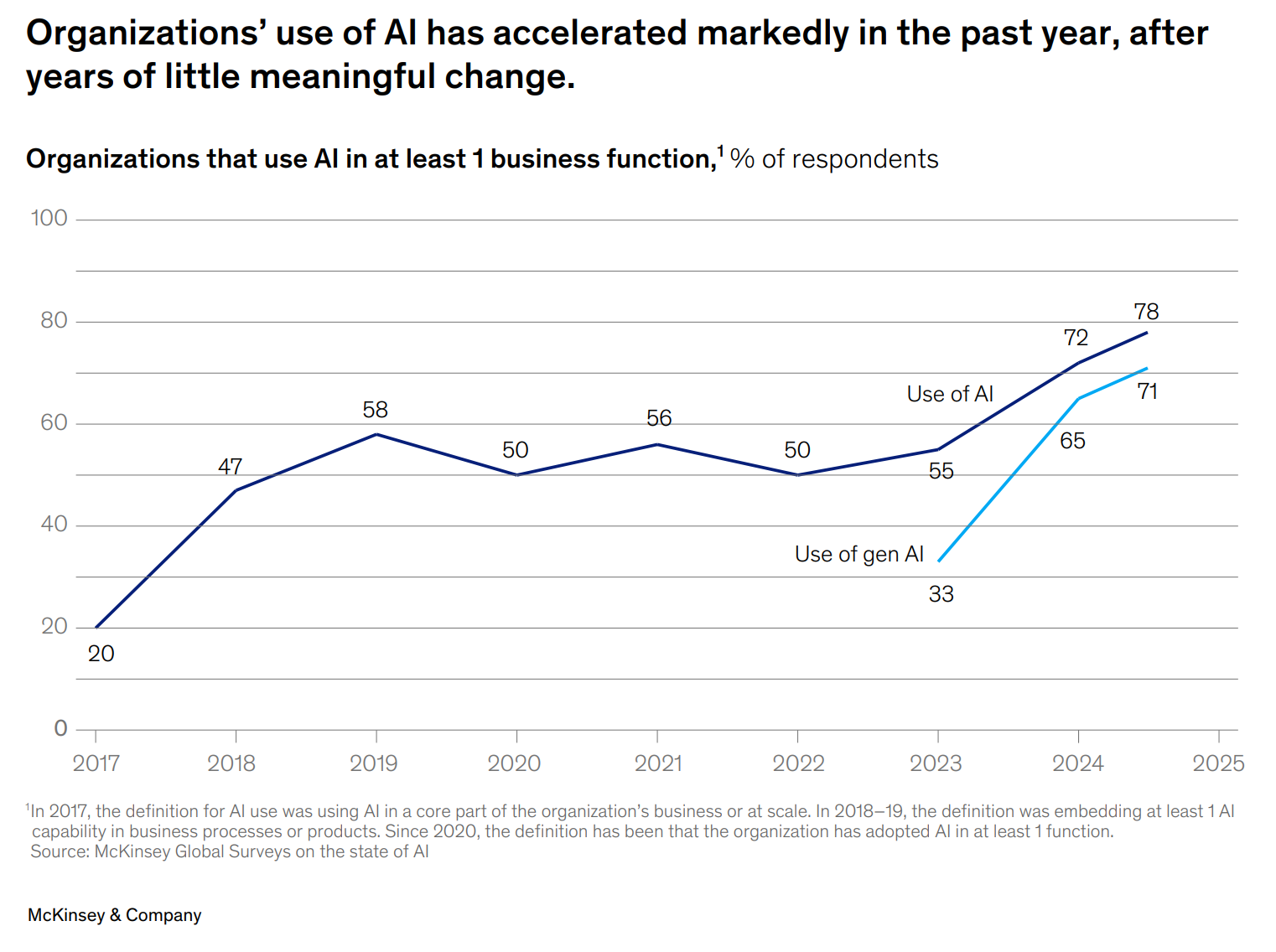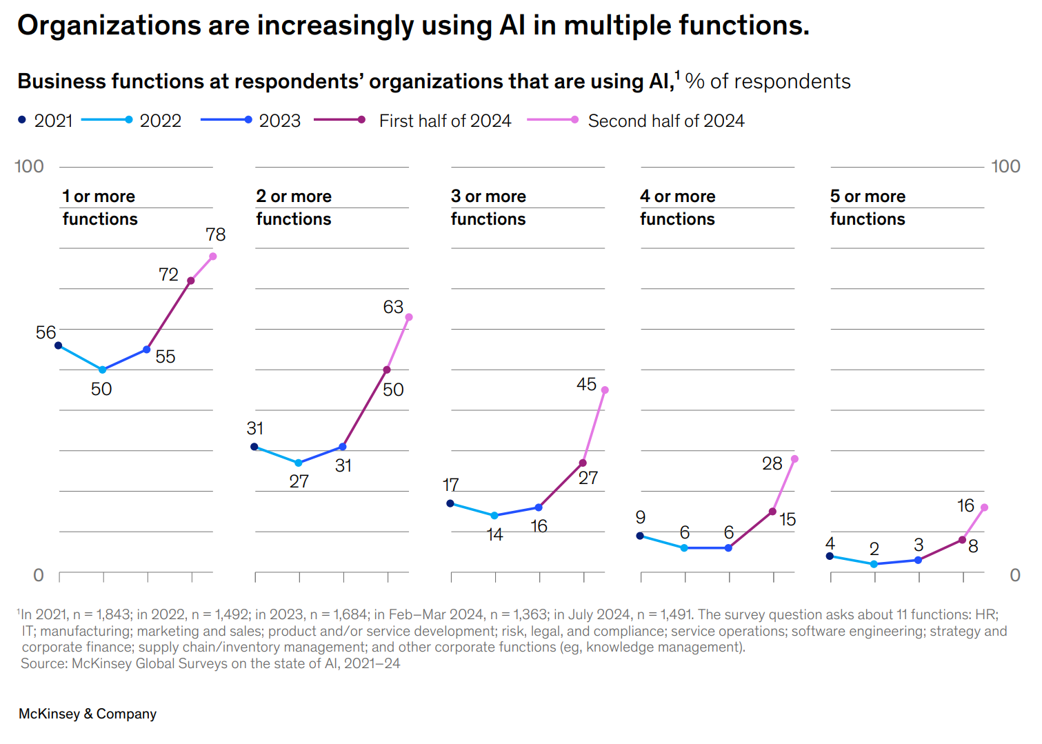 - AI를 한 개 이상 부서에서 사용하는 기업: 78%
